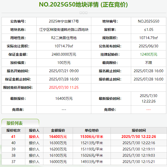 | 1 | NO.2025G49 | 栖霞区 | 17517.24 | 住宅 | 70 | 1.01-1.2 | 21020.69 | 23300 | 11084.32 | 23300 | 11084.32 | 0% | 南京栖璟投资发展有限公司 | 07-30 09:30 | 已成交 | | 2 | NO.2025G51 | 江宁区 | 48415.23 | 住宅 | 70 | 1.01-1.2 | 58098.28 | 58100 | 10000.3 | 58100 | 10000.3 | 0% | 南京芳草地置业有限公司 | 07-30 09:30 | 已成交 | | 3 | NO.2025G37 | 六合区 | 30390.7 | 住宅 | 70 | 1.01-1.7 | 51664.19 | 40500 | 7839.09 | 40500 | 7839.09 | 0% | 南京龙跃房地产开发有限公司 | 07-30 09:30 | 已成交 | | 4 | NO.2025G43 | 六合区 | 17985.12 | 住宅 | 70 | 1.01-1.4 | 25179.17 | 15300 | 6076.45 | 15300 | 6076.45 | 0% | 南京邑居建设发展(集团)有限公司 | 07-30 09:30 | 已成交 | | 5 | NO.2025G44 | 六合区 | 48852.83 | 住宅 | 70 | 1.01-1.05 | 51295.47 | 21000 | 4093.93 | 21000 | 4093.93 | 0% | 南京棠盛置业有限公司 | 07-30 09:30 | 已成交 | | 6 | NO.新区2025G05 | 江北新区 | 19629.38 | 商住 | 40/70 | 1.01-1.2 | 23555.26 | 18750 | 7960.01 | 18750 | 7960.01 | 0% | 南京昕科资产管理有限公司 | 07-30 09:30 | 已成交 | | 7 | NO.新区2025G06 | 江北新区 | 18195.47 | 住宅 | 70 | 1.01-1.8 | 32751.85 | 12492 | 3814.14 | 12492 | 3814.14 | 0% | 南京扬子江开发置业有限公司 | 07-30 09:30 | 已成交 | | 8 | NO.新区2025G07 | 江北新区 | 48444.54 | 住宅 | 70 | 1.01-1.05 | 50866.77 | 60949 | 11982.09 | 60949 | 11982.09 | 0% | 南京新居置地有限公司 | 07-30 09:30 | 已成交 | | 9 | NO.新区2025G08 | 江北新区 | 84441.94 | 住宅 | 70 | 1.01-1.05 | 88664.04 | 171071 | 19294.29 | 171071 | 19294.29 | 0% | 南京扬子江开发置业有限公司 | 07-30 09:30 | 已成交 | | 10 | NO.新区2025G09 | 江北新区 | 34623.19 | 住宅 | 70 | 1.01-1.6 | 55397.1 | 97388 | 17579.98 | 97388 | 17579.98 | 0% | 南京扬子江开发置业有限公司 | 07-30 09:30 | 已成交 | | 11 | NO.2025G42 | 秦淮区 | 26856.72 | 住宅 | 70 | 1.01-1.6 | 42970.75 | 116200 | 27041.65 | 116400 | 27088.19 | 0.17% | 江苏象屿置业有限公司 | 07-30 09:35 | 已成交 | | 12 | NO.2025G47 | 鼓楼区 | 4216.01 | 住宅 | 70 | 1.01-2.2 | 9275.22 | 28100 | 30295.77 | 37300 | 40214.68 | 32.74% | 温州千亿房地产开发有限公司(杭州北谷) | 07-30 09:45 | 已成交 | | 13 | NO.2025G50 | 江宁区 | 10714.79 | 住宅 | 70 | 1.01-1.05 | 11250.53 | 12400 | 11021.7 | 16600 | 14754.86 | 33.87% | 南京朗翌置业有限责任公司 | 07-30 11:25 | 已成交 |